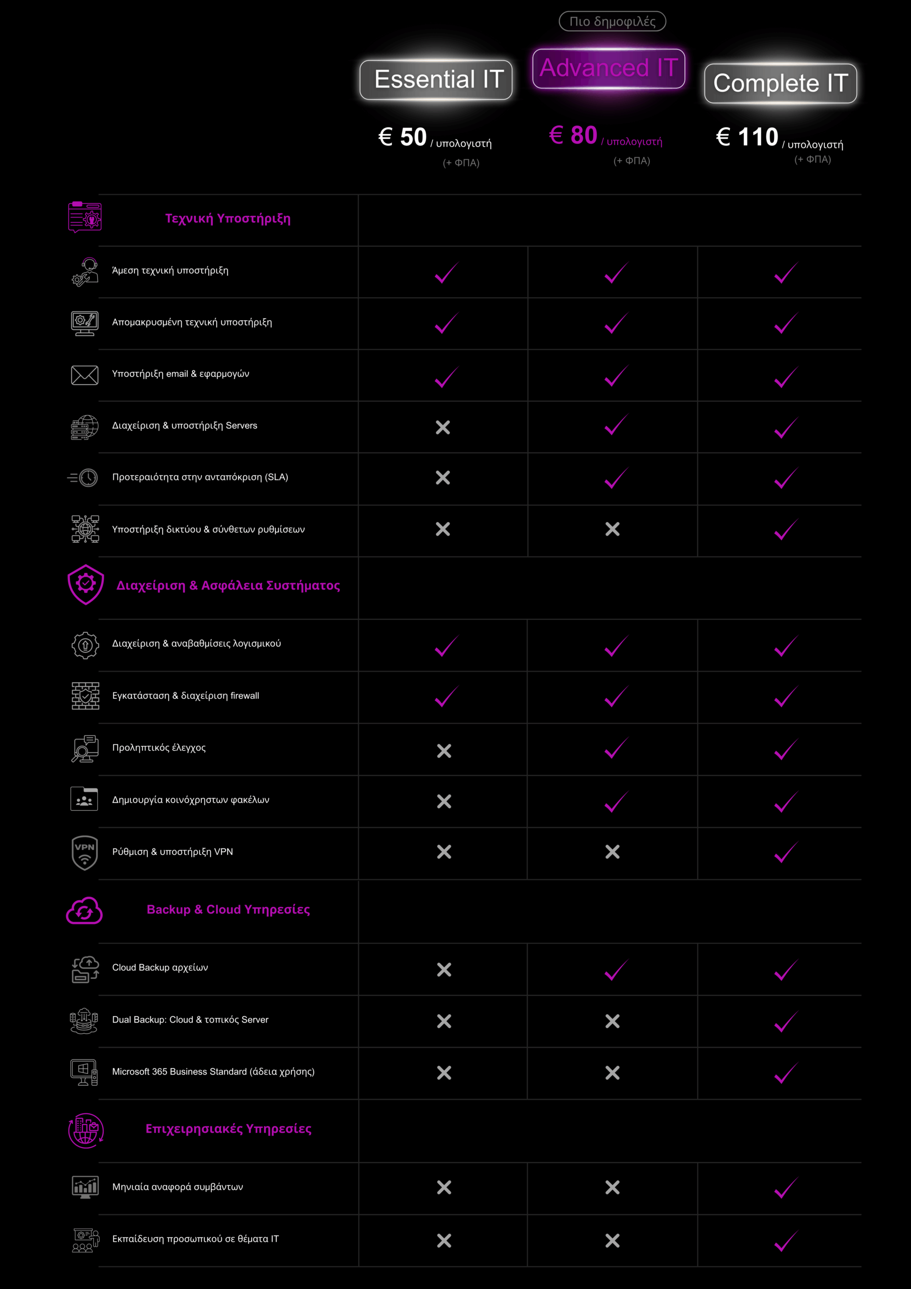 Συγκρίνετε εύκολα τις παροχές κάθε πακέτου στον παρακάτω πίνακα και επιλέξτε εκείνο που ανταποκρίνεται καλύτερα στο δικό σας ψηφιακό όραμα. Η ομάδα μας είναι πάντα διαθέσιμη να σας βοηθήσει να κάνετε τη σωστή επιλογή — γιατί η τεχνολογία πρέπει να λειτουργεί υπέρ της ανάπτυξής σας, με διαφάνεια και ασφάλεια.